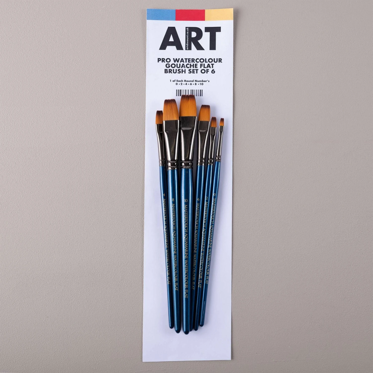 A set of 6 ARTdiscount Professional Short Handle Flat brushes, which suitable for both Watercolour and Gouache painting.