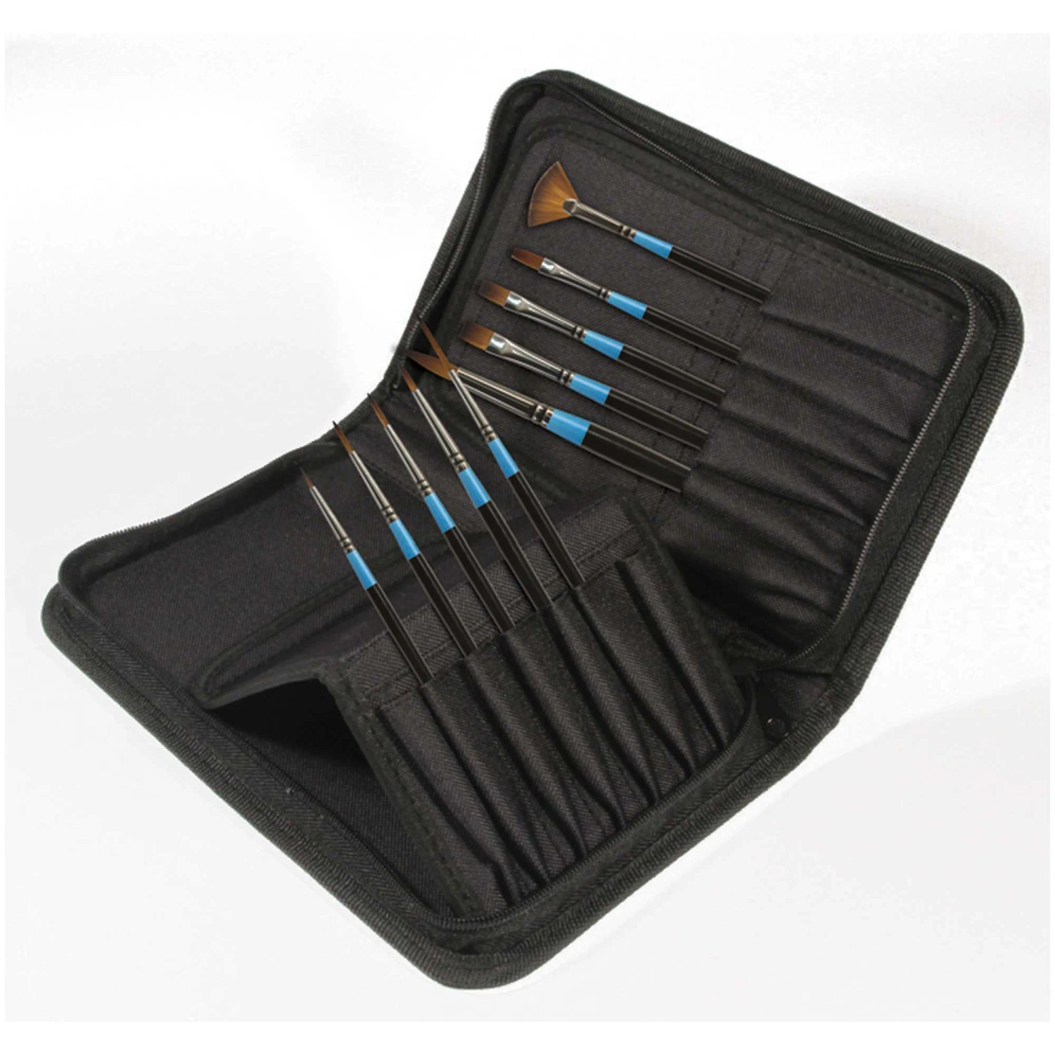 The Daler-Rowney Aquafine Brush Set contains 10 short handled paint brushes in a handy, sturdy zip case.