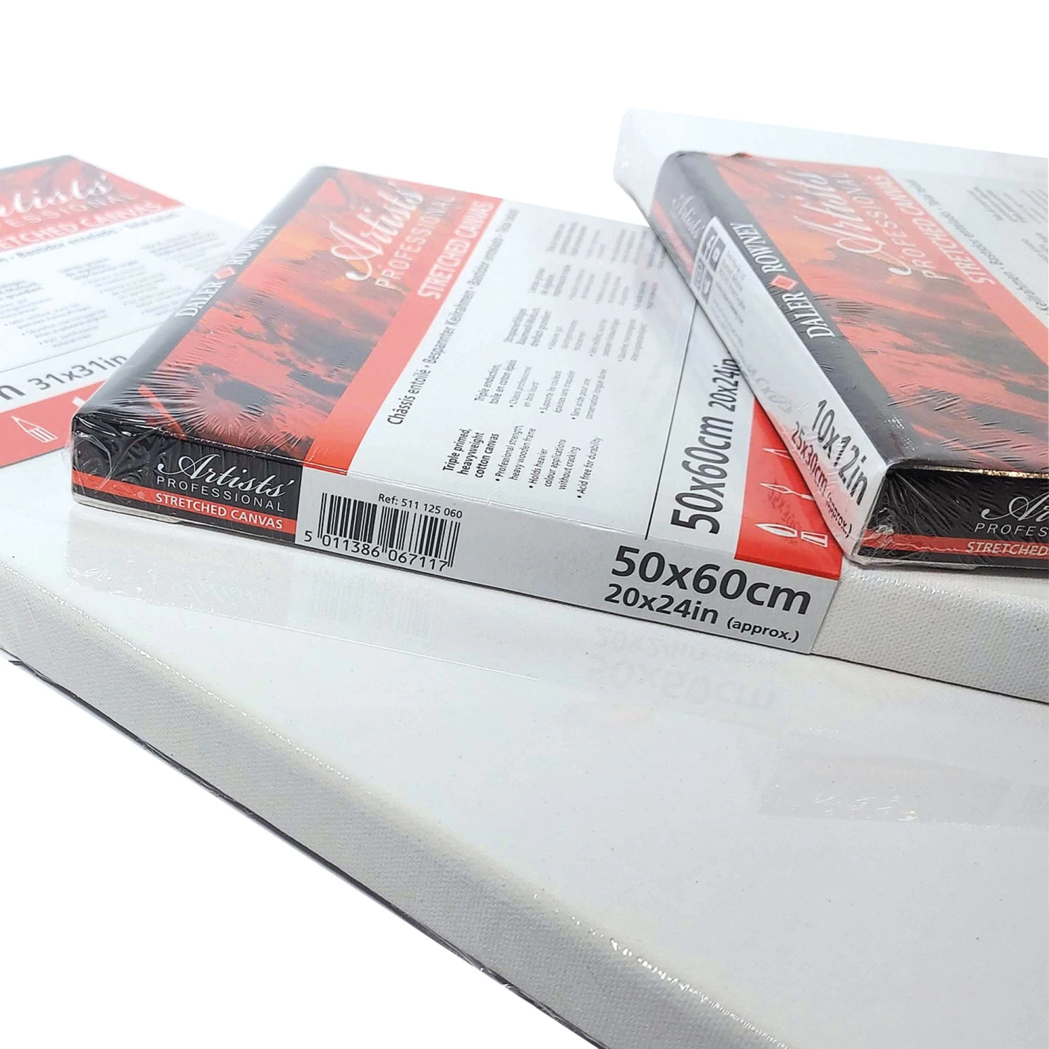 Daler-Rowney Artists’ Stretched Canvases are stapled on the back to give clean edges and come complete with wooden wedges to adjust tension in the traditional manner and they are individually wrapped to protect the surface.