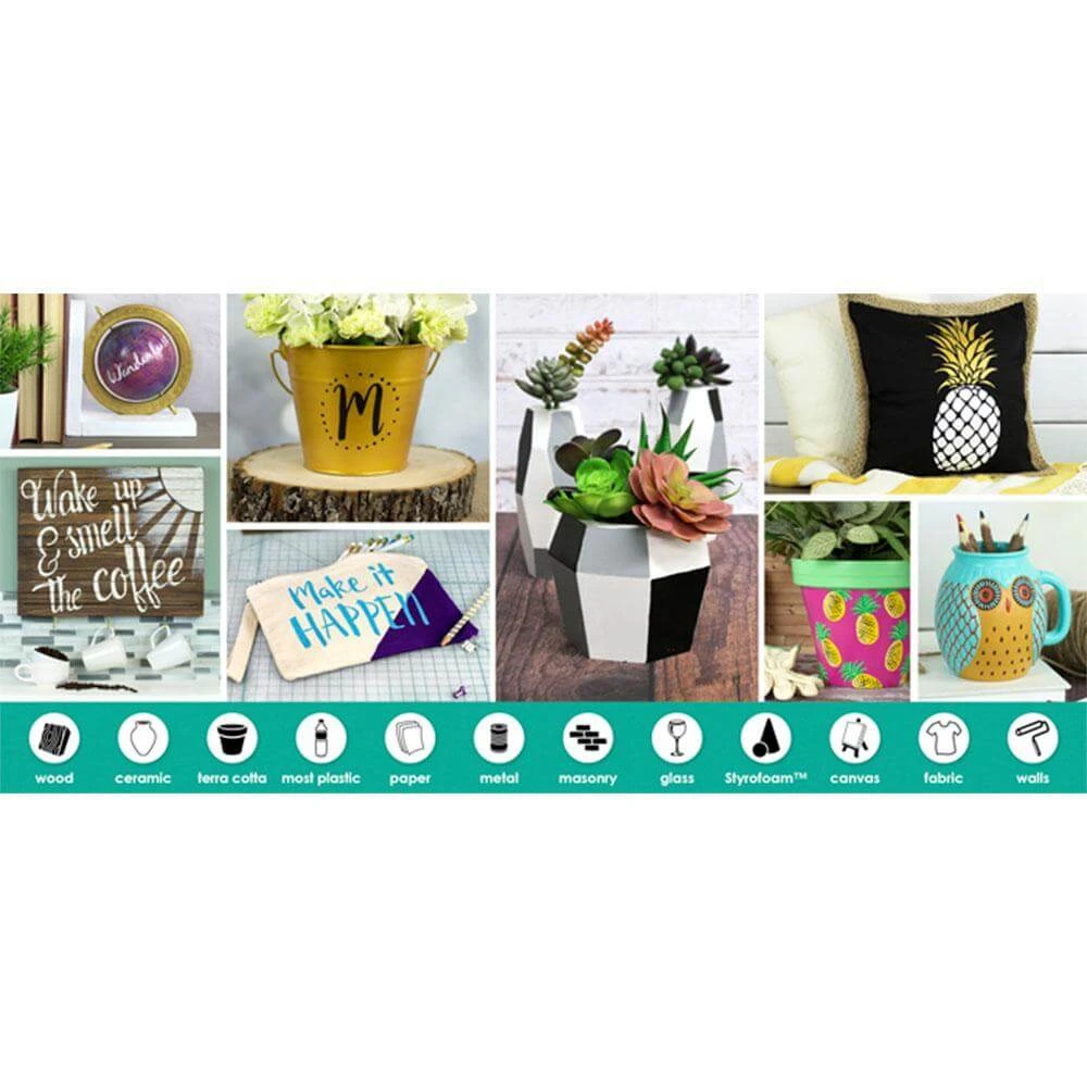 Can be used on the following surfaces: paper, canvas, wood, plaster, air drying clay, heated ceramic, glass, styrofoam, most plastic, fabric, masonry, walls, metal, terracotta.