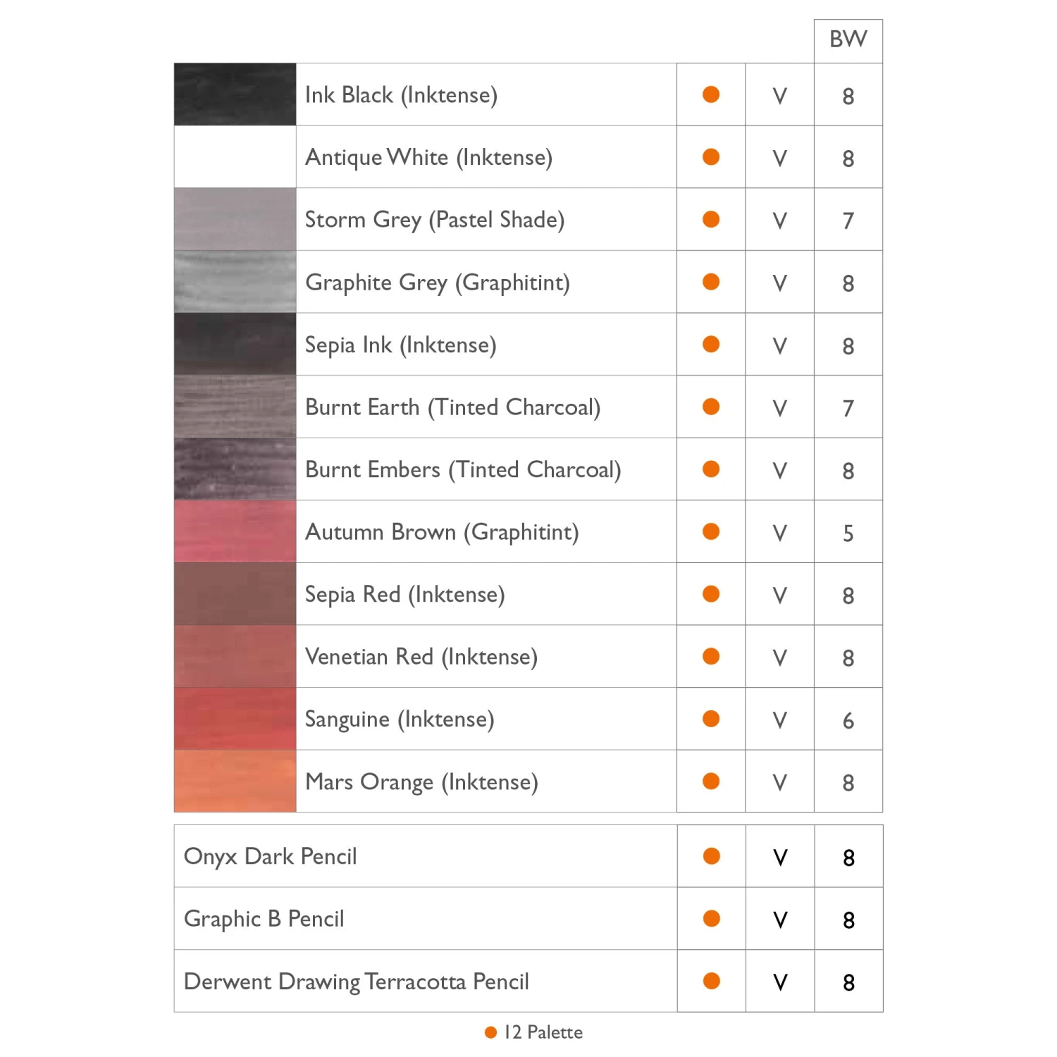- Colour Palette: Black, White, Storm Grey, Graphite Grey, Sepia Ink, Burnt Earth, Burnt, Embers, Autumn Brown, Sepia, Venetian Red, Sanguine and Mars Orange.