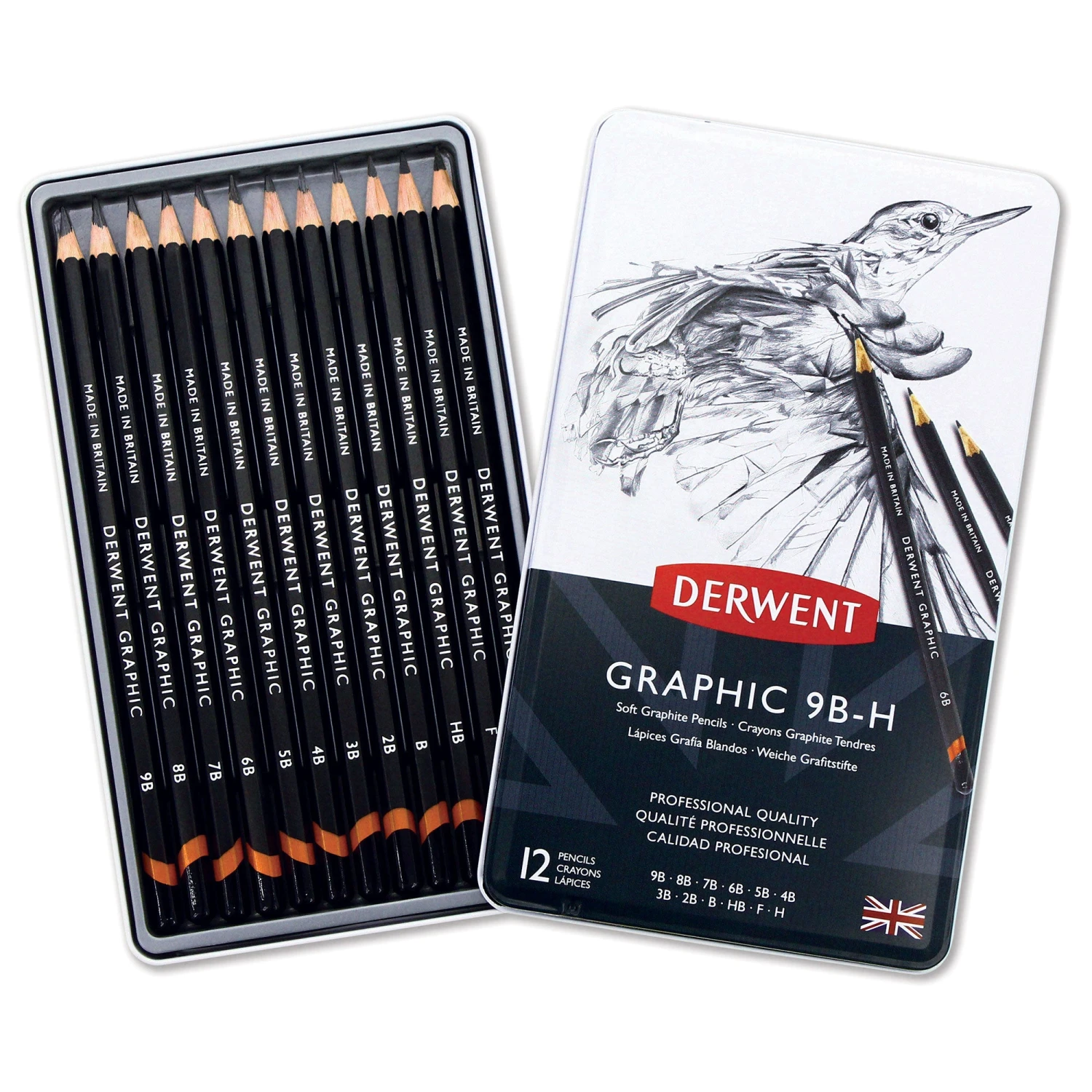 Contains 12 soft pencils (9B, 8B, 7B, 6B, 5B, 4B, 3B, 2B, B, HB, F, H) in a tin.