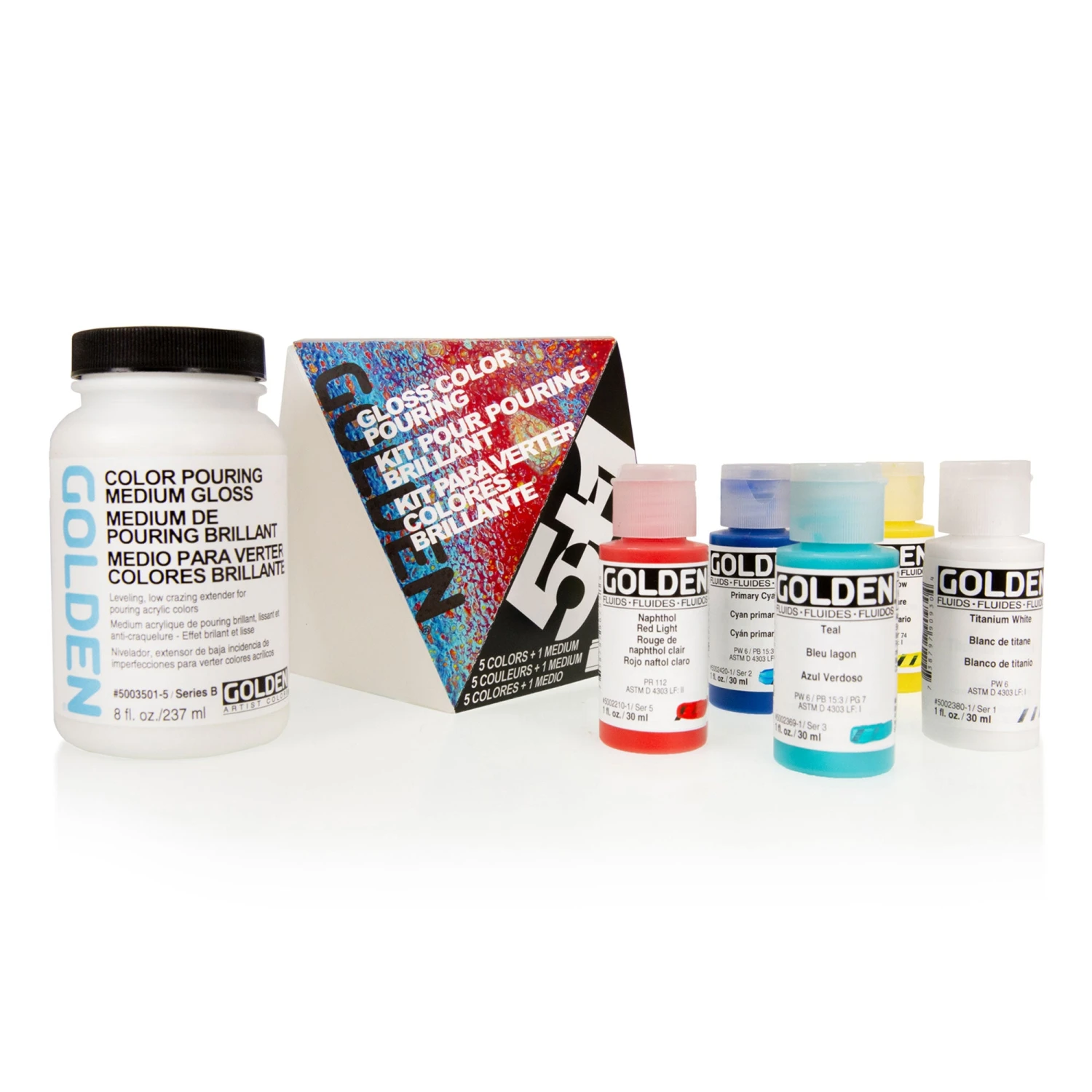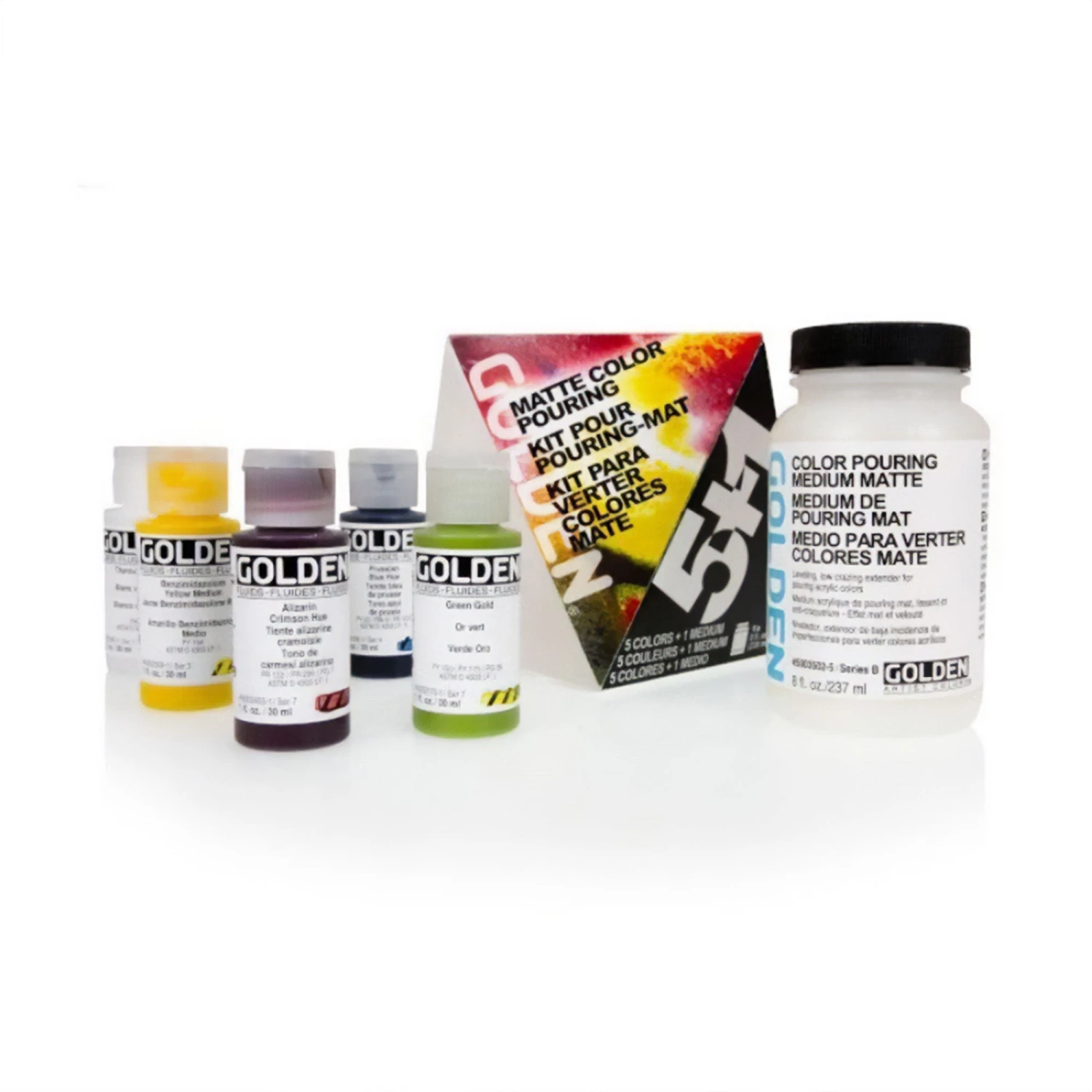 These Artist Quality Acrylic Pouring Sets contain a 237ml bottle of Golden Colour Pouring Medium in either Gloss or Matte. These are a levelling, low crazing extender for acrylic pouring.