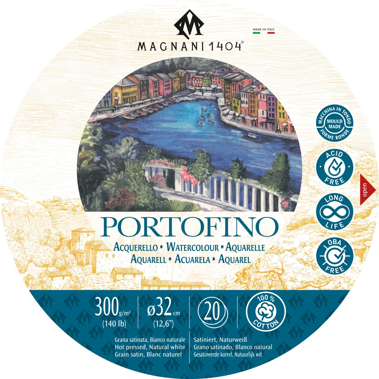 Portofino paper has a hot pressed surface and is especially indicated for all the wet techniques like watercolour, gouache, ink and acrylics.
