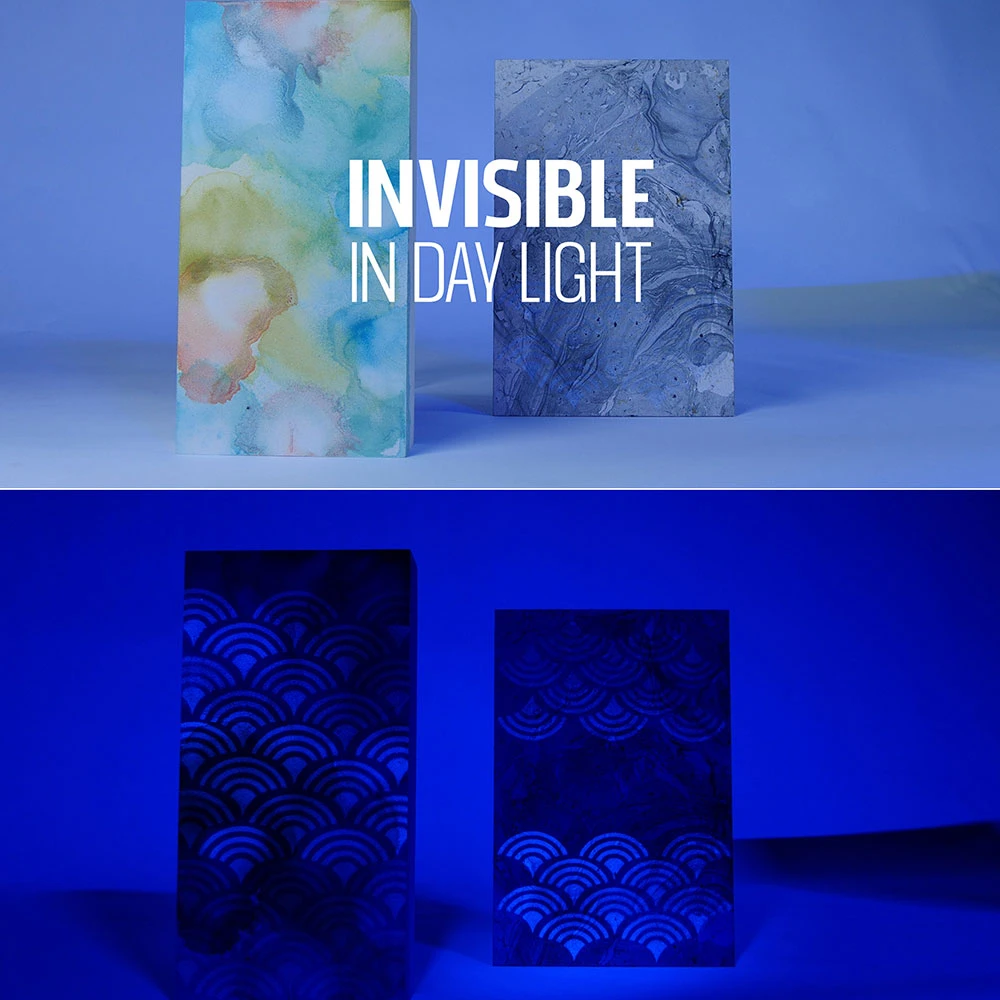 The Montana UV EFFECT Spray can be applied to numerous substrates such as coated and uncoated screens, masonry, wood, glass and more. The UV light effect becomes more prevalent, the more coats are applied particularly when applied with a stencil.