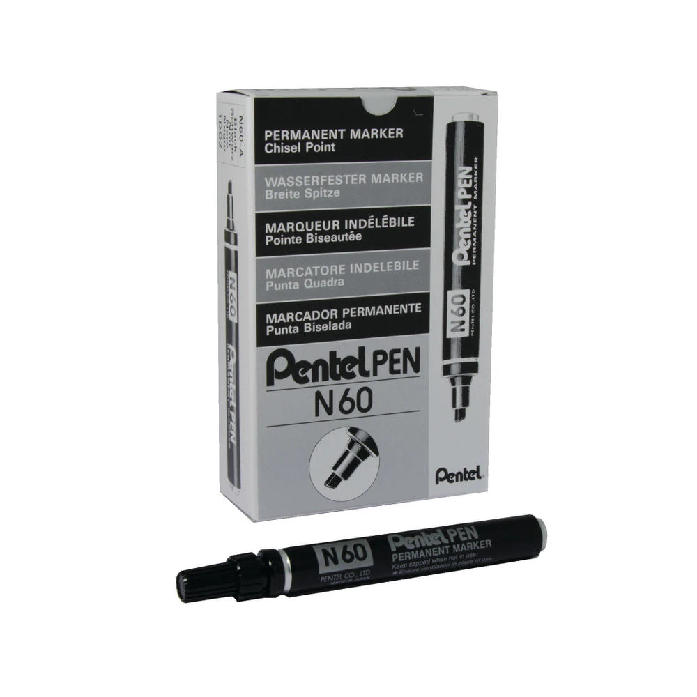 These Pentel Black Chisel Point Permanent Markers are supplied in a box of 12, perfect for writing on important supplies, boxes, lists, and more. They feature a robust aluminium barrel and a bonded fibre tip that retains its shape.