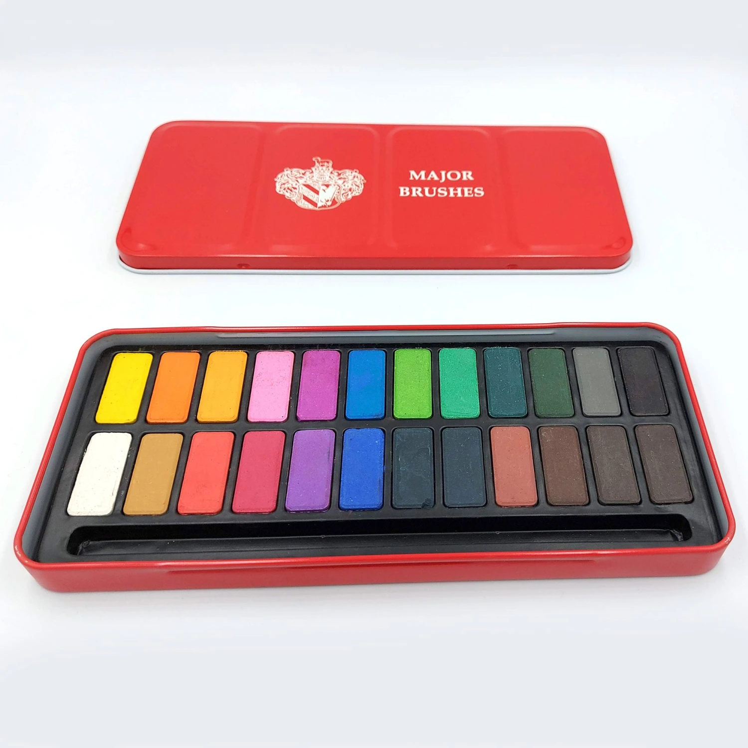 A durable metal tin containing watercolour paint blocks. Available in two sizes — a 12 set and a 24 set. The inside surface of lid is white and incorporates mixing palette wells. Theses are ideal as school-grade watercolour painting tins.