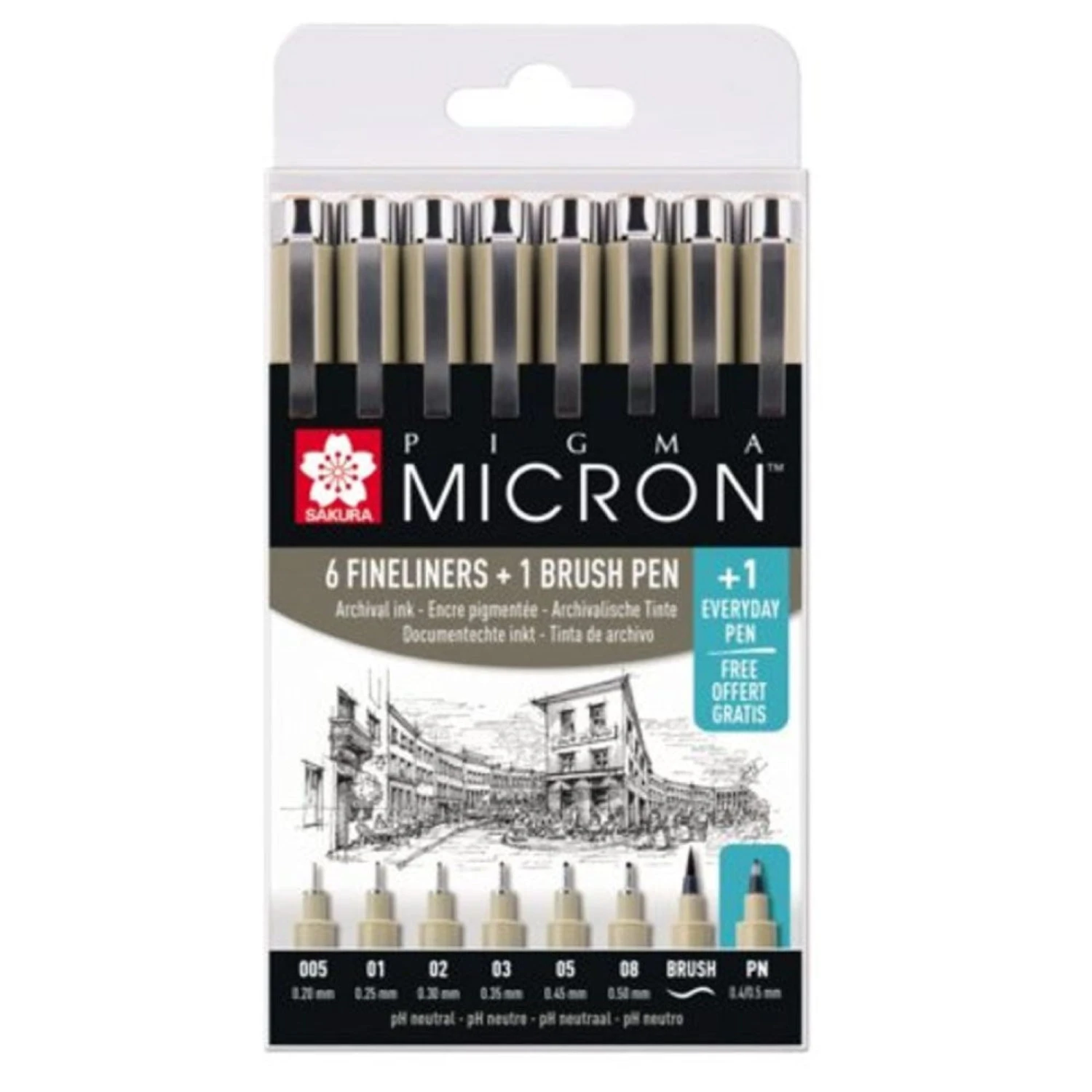 This set of Sakura Pigma Micron Fineliners contains eight pens with Pigma ink. Invented by Sakura in Japan over 25 years ago, they continue to be the most reliable permanent ink pens on the market today. Many artists consider Pigma Micron essential for any archival quality illustration project.