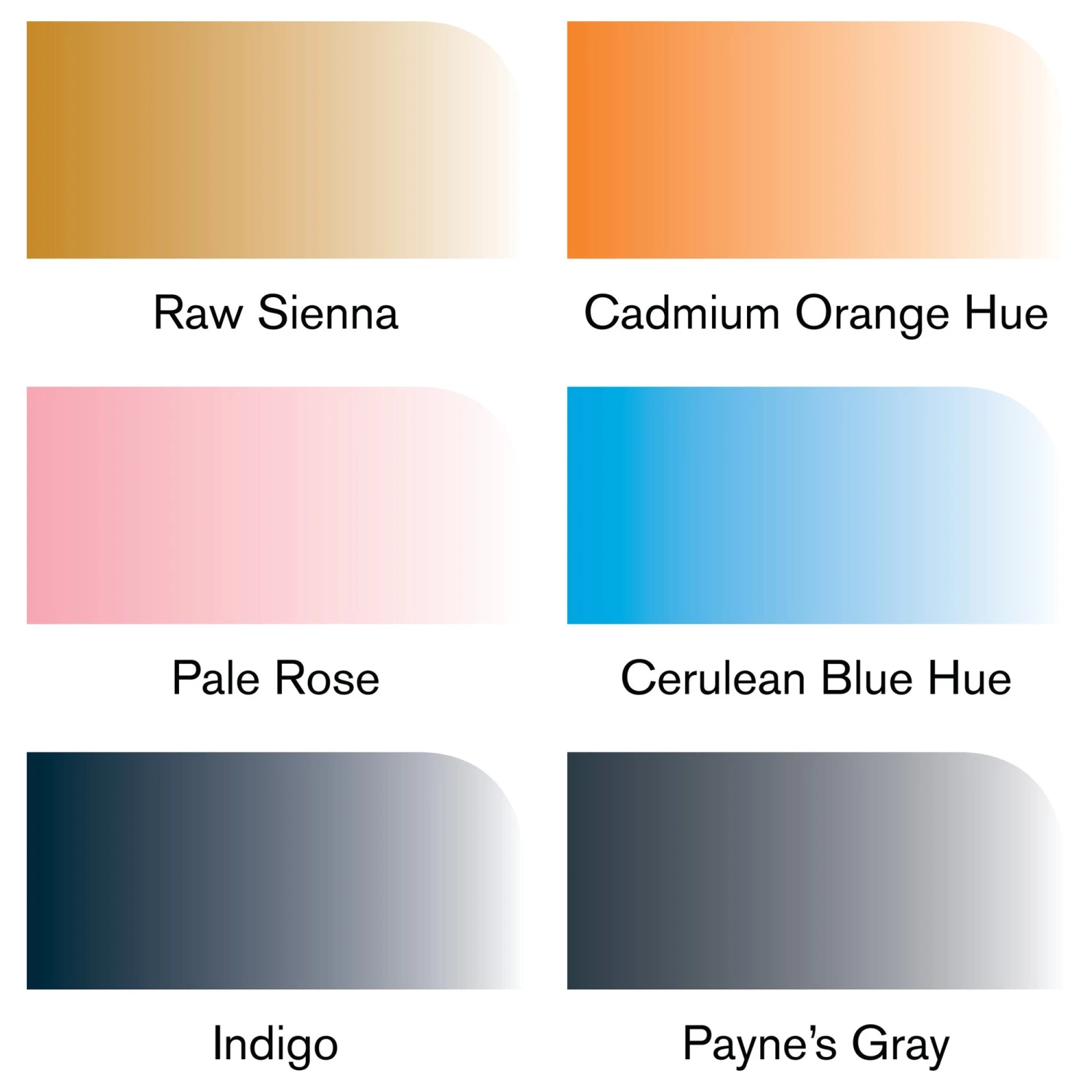 Raw Sienna, Cadmium Orange Hue, Pale Rose, Cerulean Blue Hue, Indigo, Payne’s Gray